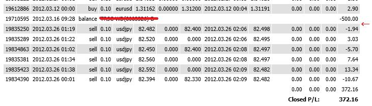 <入出金履歴> 初回入金500ドル(手数料-12.3ドル) 3/16出金500ドル(原資分)